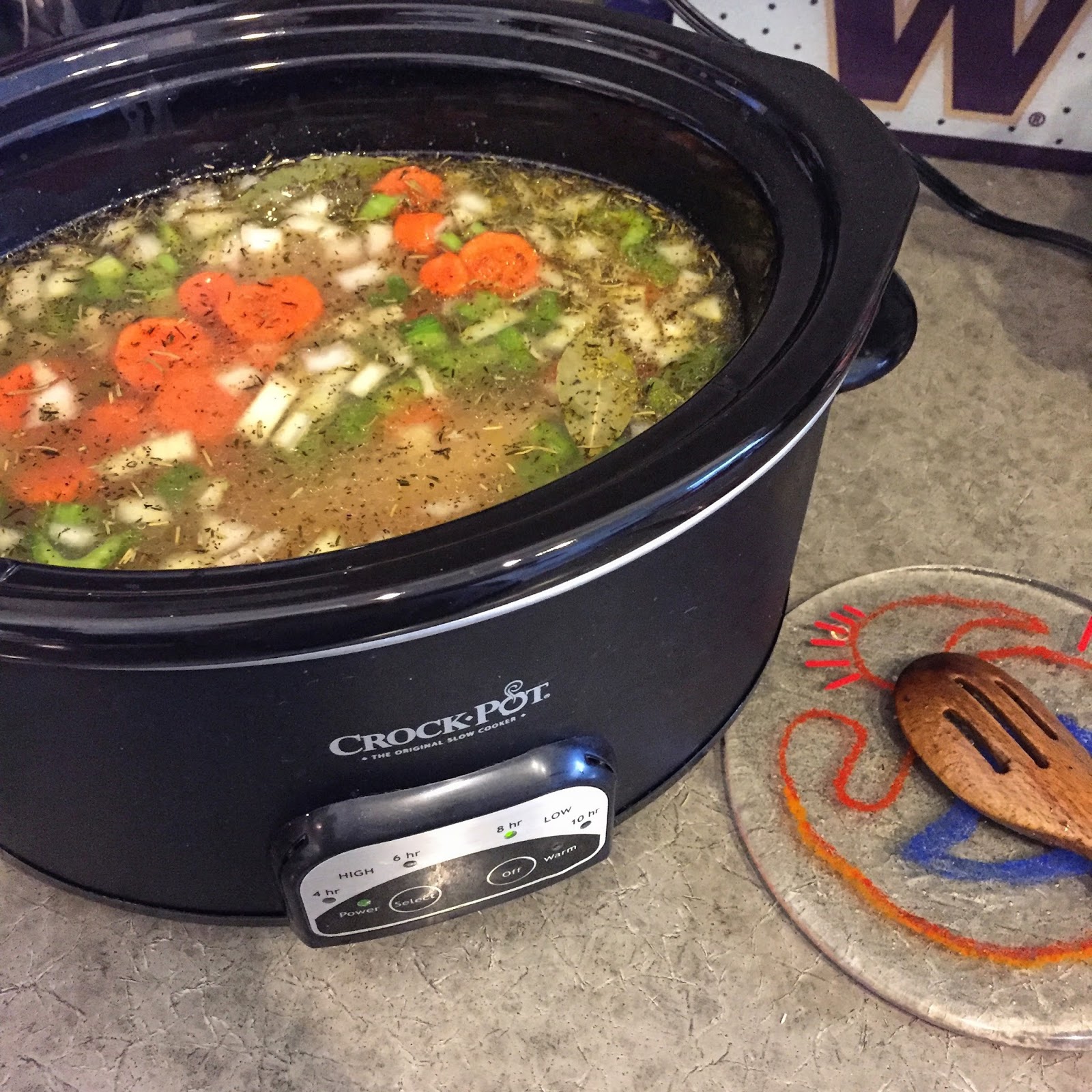 - To a slow cooker, add chicken (un-cut), diced carrots, onion, celery, and garlic. Drizzle olive oil over top then add in chicken broth, water, thyme, rosemary, celery seed, bay leaves and season with salt and pepper to taste. Cover and cook on low heat 6 – 7 hours.