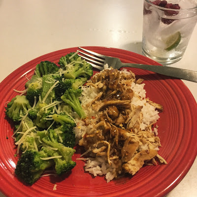I used frozen breasts and they were done in less than four hours on high. The original recipe doesn’t mention this, but I shredded the chicken after I removed it from the crockpot. I thought about serving this on rice noodles but holy cow…they are expensive so I opted for jasmine rice.