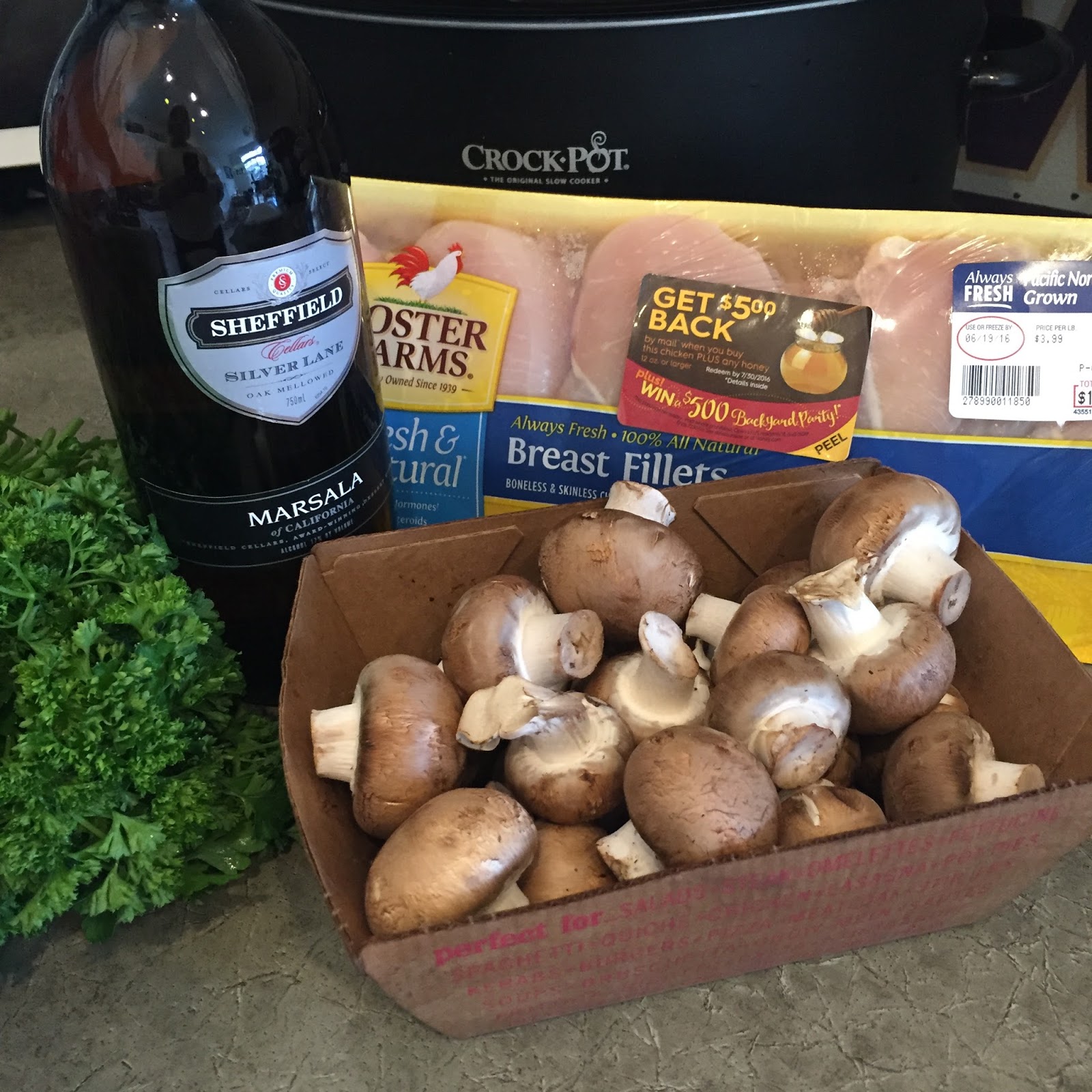 Top chicken with garlic, mushrooms, and marsala wine. Cover and cook for 5-6 hours on low.