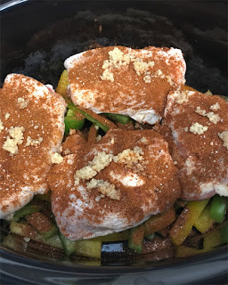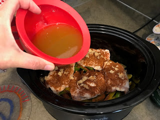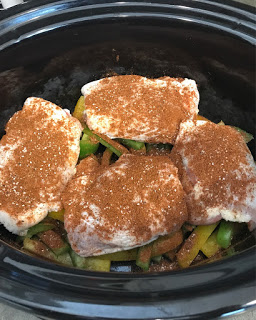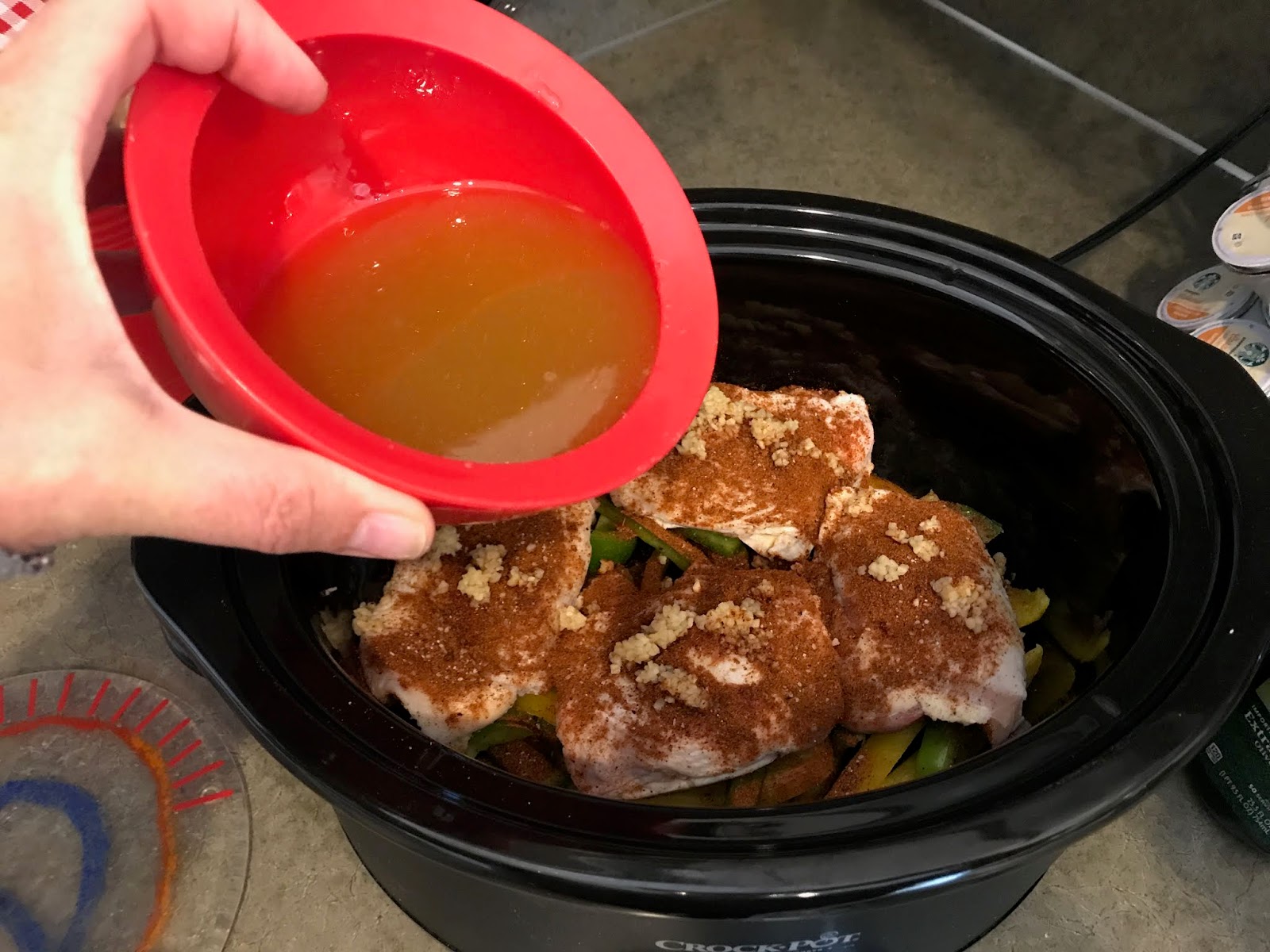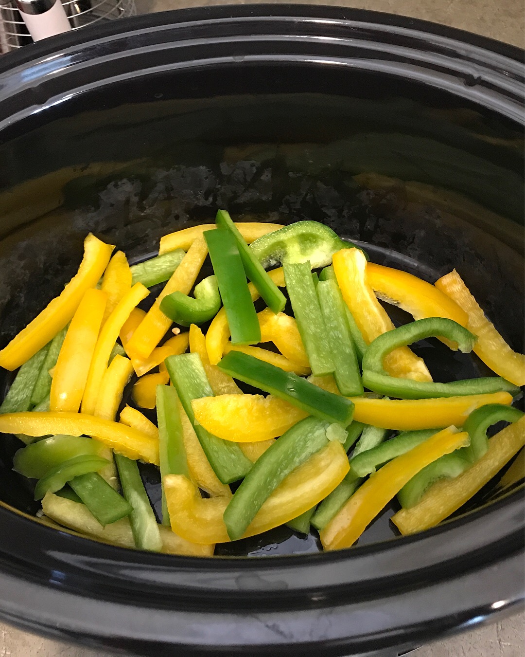 1. Arrange bell pepper into the bottom of your slow cooker and spread into an even layer. Top with chicken thighs.