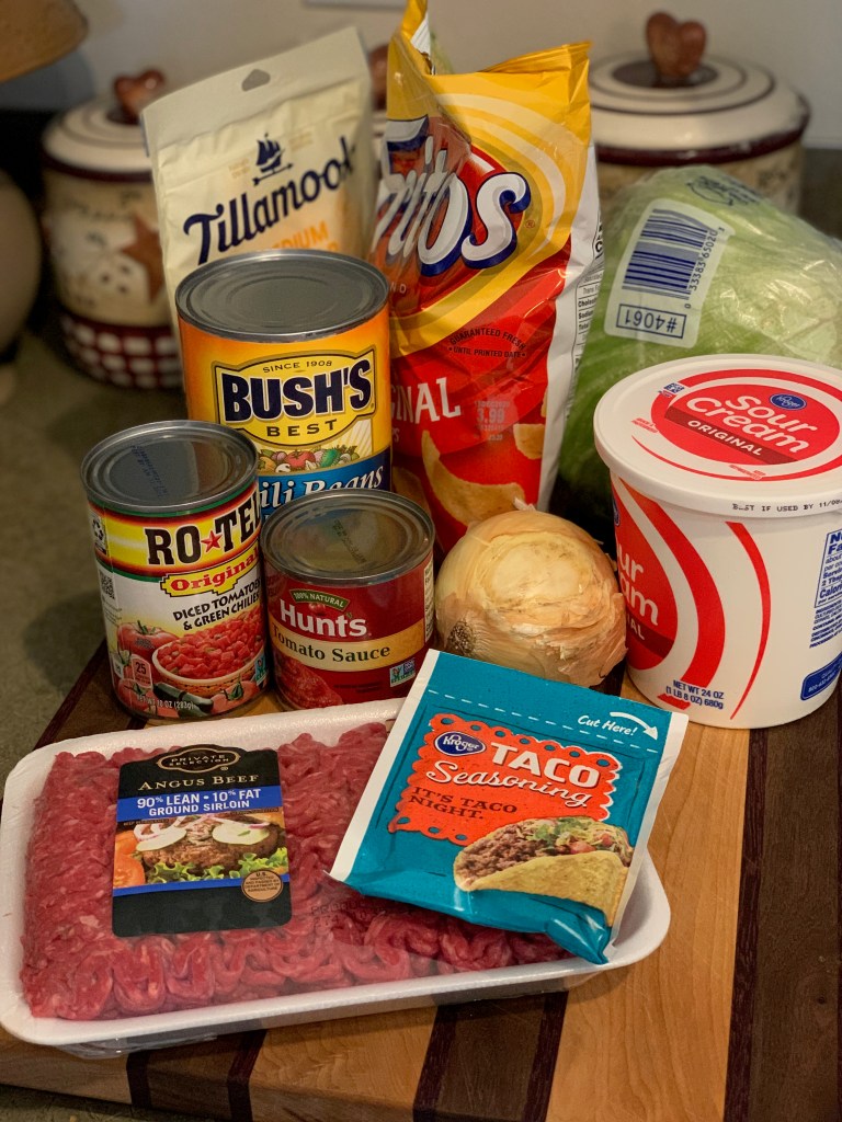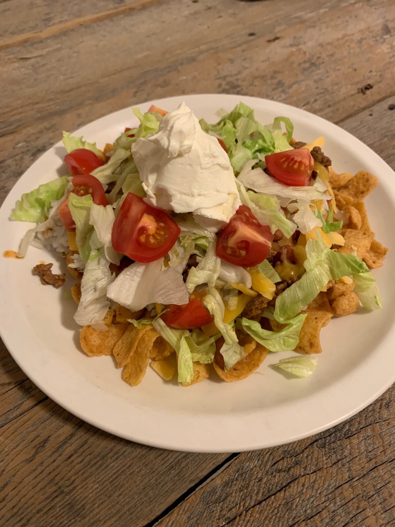 To assemble: Place a layer of Fritos on your plate. Place a couple spoonfuls of rice on the chips. Top with bean/meat mixture (I used a slotted scoop to control the amount of sauce I wanted on my plate). Next add shredded cheese, lettuce, tomatoes, sour cream, etc…
