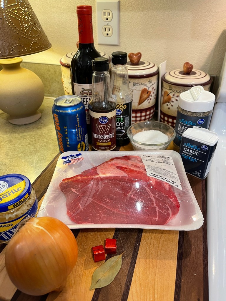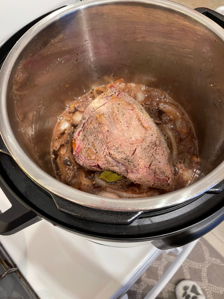 Then add the bay leaf, brown sugar, Worcestershire sauce, soy sauce, bullion cube, minced garlic, and beer to the pot. Give it a quick stir. Add the roast back into the pot and hit “cancel” to stop the sauté function. Place the lid on your Instant Pot and pressure cook the roast for 1 hour, 40 minutes. Let Instant Pot naturally release for 25 minutes.