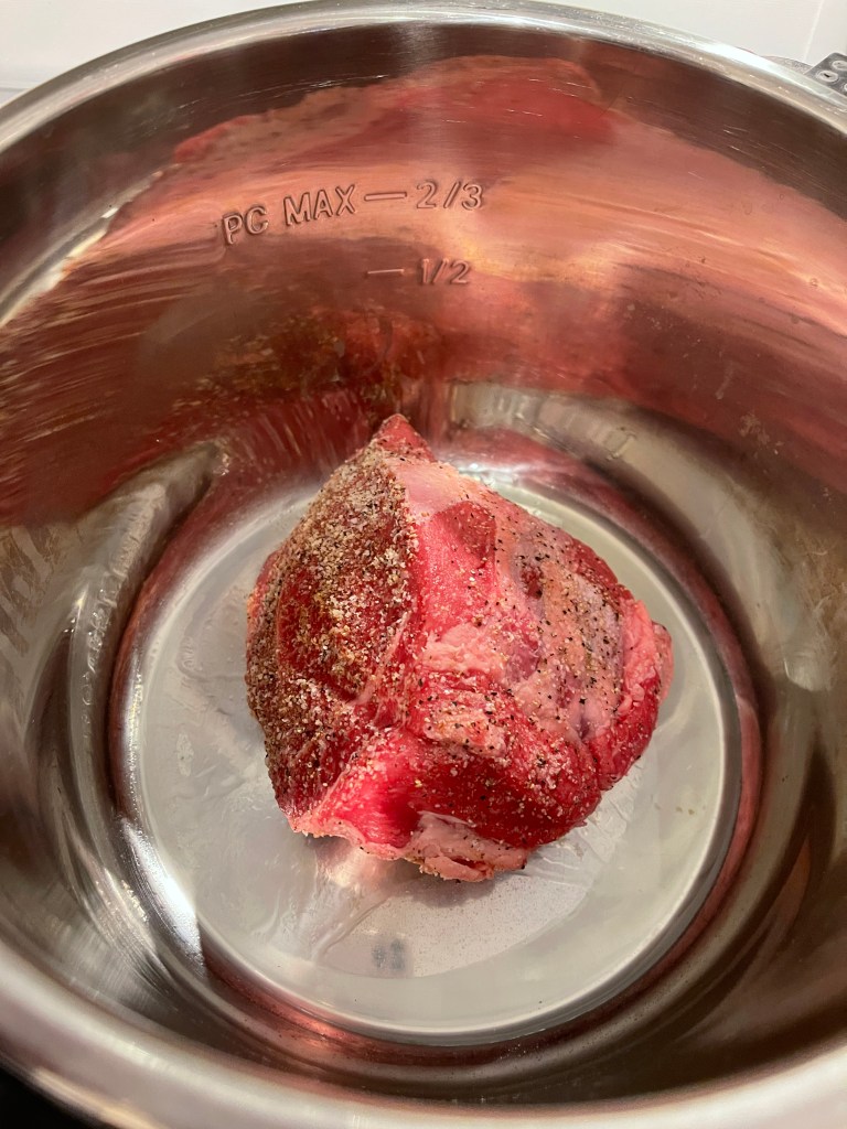 Take beef out of refrigerator about 15 minutes prior to beginning to take the chill off. Set Instant Pot to Sauté. Season the roast with the combined salt, pepper, and garlic powder on all sides. When the pot is hot, add the vegetable oil and brown the roast on all sides.