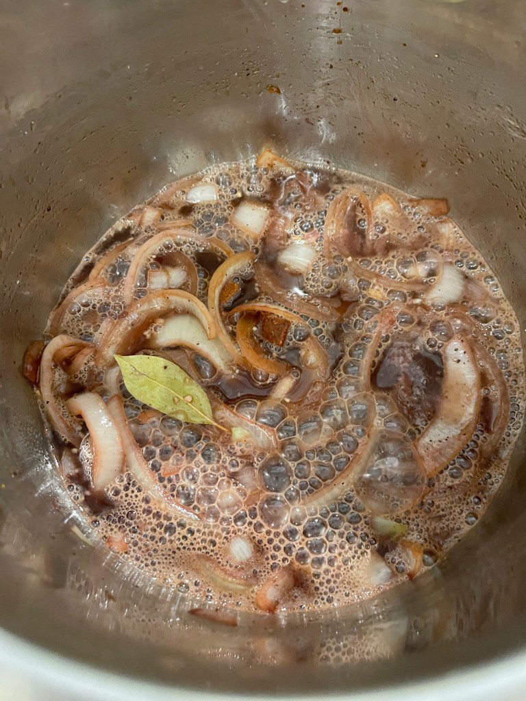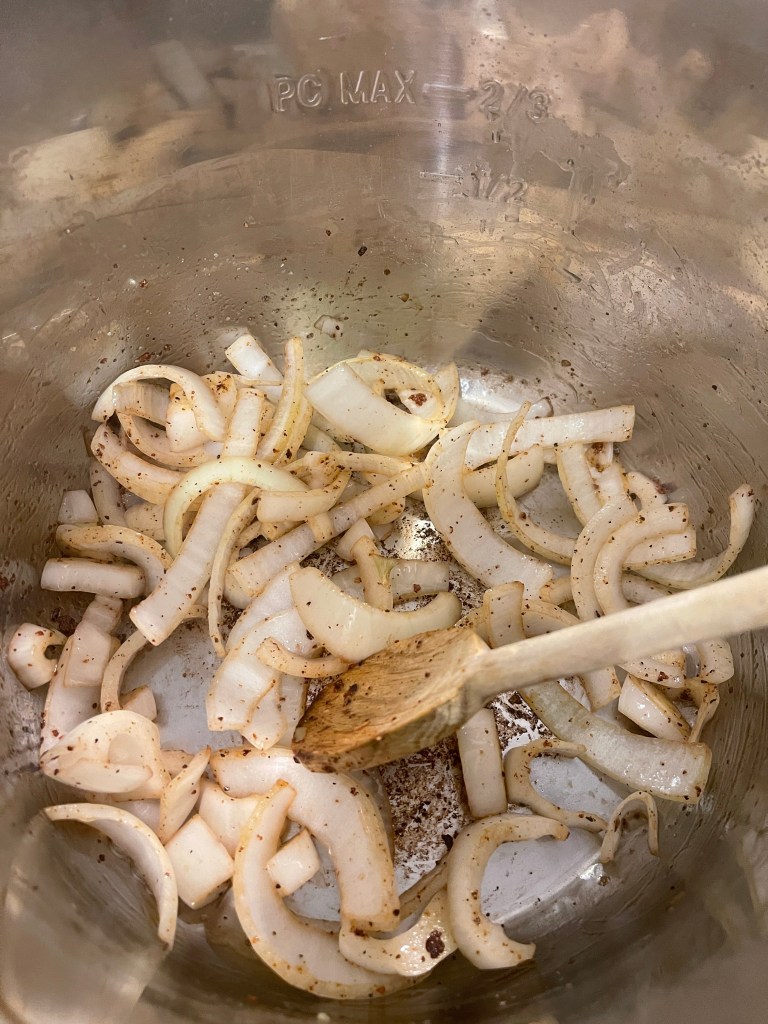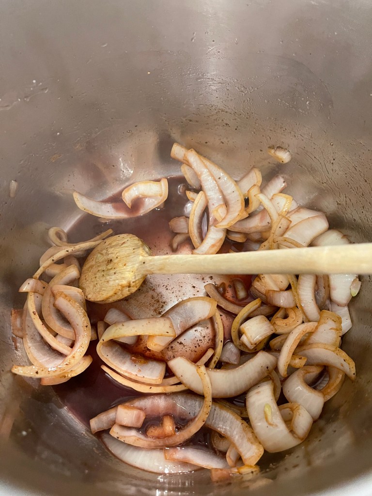 Remove roast from the Instant Pot and add the sliced onions. Sauté for about two minutes. Add the red wine to the onions, deglazing the bottom of the pot by scraping the browned bits with a wooden spoon. Let the red wine cook down just a bit, about two minutes.