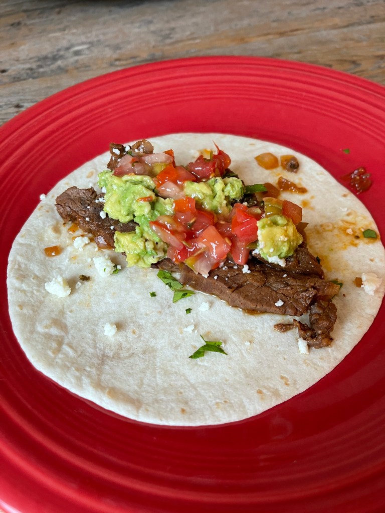 Remove lid, stir meat, and serve on tortillas with your favorite toppings. The meat should fall apart – mine practically shredded on it’s own because it was so tender.